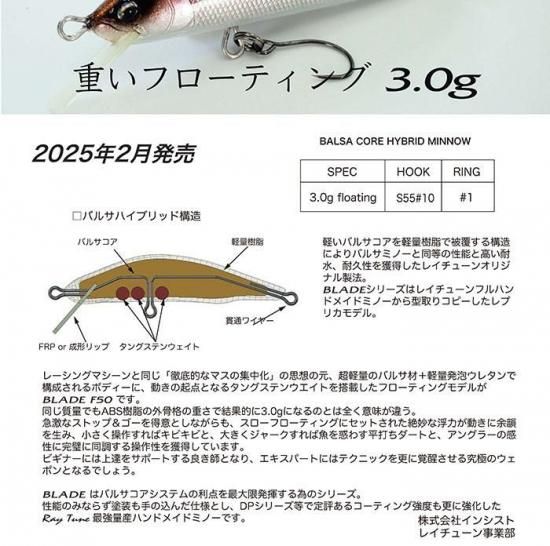 軽いバルサコアを軽量樹脂で被覆する構造によりバルサミノーと同等の性能と高い耐水、耐久性を獲得したレイチューンオリジナル製法。BLADEシリーズはレイチューンフルハンドメイドミノーから型取りコピーしたレプリカモデル。 レーシングマシーンと同じ「徹底的なマスの集中化」の思想の元、超軽量のバルサ材+軽量ウレタンで構成されるボディーに、動きの起点となるタングステンウエイトを搭載したフローティングモデルがBLADE F50です。急激なストップ&ゴーを得意としながらも、スローフローティングにセットされた絶妙な浮力が動きに余韻を生み、小さく操作すればキビキビと、大きくジャークすれば魚を惑わす平打ちダートと、アングラーの感性に完璧に同調する操作性を獲得しています。 ビギナーには上達をサポートする良き師となり、エキスパートにはテクニックを更に覚醒させる究極のウェポンとなるでしょう。