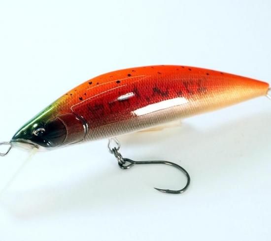 バルサミノーの高性能に、精密な3Dモデリングデザインを施す新製法の最新鋭トラウトミノー。 DP62RSには、ユーザー自らのセッティングの幅を持たせる目的で、あえて大きめのファイバーリップを装着している。 シングルフックで使いたいユーザーは少しリップを削るとウォブリング幅が押さえられて扱いやすくなるだろう。 ST-36BC#14のトレブルフックを前後に装着すれば、泳ぎはタイトウォブンロールとなり、高速限界が飛躍的に高まる。 ここ一番のポイントで確実に大物を仕留める為に事前にセッティングを済ませておけば、一撃でヒットさせることができるだろう。
