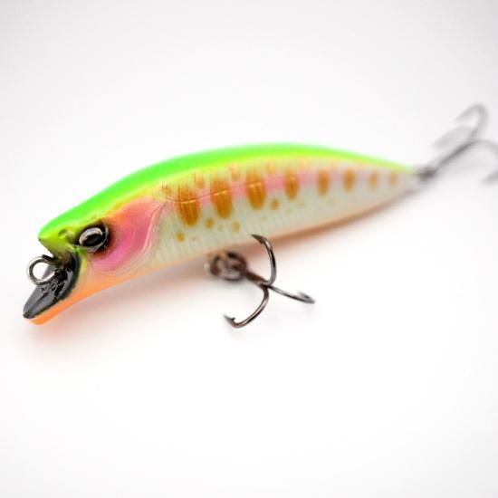 形からは想像しがたい超ハイピッチウォブンロールとロール強めの平打ちが魚のバイトスイッチを強制的に入れてしまう。 東北テスト釣行でも、あのDP45RSmk3の2倍の釣果を叩き出した爆釣ミノー。 トゥイッチが楽しくてたまらない操作感と圧倒的釣果。 是非、使って驚いて下さい。 お勧めのライトチューンは、カルティバS55M#8のシングルフックチューン。 テスト時、このチューンでイワナが3時間で50匹越えという驚異的釣果が得られました。