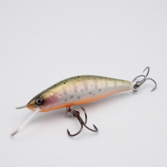 ●GENE454横アイ 2.3g スローシンキング 釣り人のフィッシングスタイルはミノーの性能によって規定される。 いつしかミノーが応えてくれる範囲の操作しかしなくなり それが唯一の正解と思い込み、他の釣り方を想像すら出来なくなる。 これがアマチュアの陥りやすい罠だ。 常に強めのアクションを与えるスタイルのアングラーにとって トレンドのヘビーシンキングミノーの重く鈍重な性能は 時にフラストレーションの原因となっているだろう。 激流の流心直下に潜む強い個体を 強いトゥイッチのきらめく明滅で誘い出す事の出来るミノーが いったい幾つあると言うのか。 それを実現しているのは、恐らくレイチューン製品と ごく一部のマニアックなバルサミノーブランドだけだろう。 ましてや45mmでそれをやるとなると… 釣りのイマジネーションを拡張するミノー その答えが「レイチューン」であり「GENE454」なのである。
